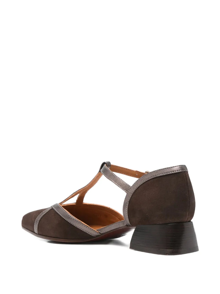 Zapatos Chie Mihara Hidrow en ante marrón y piel metalizada. Diseño retro, tacón bajo de 3 cm y confort artesanal hecho en España.