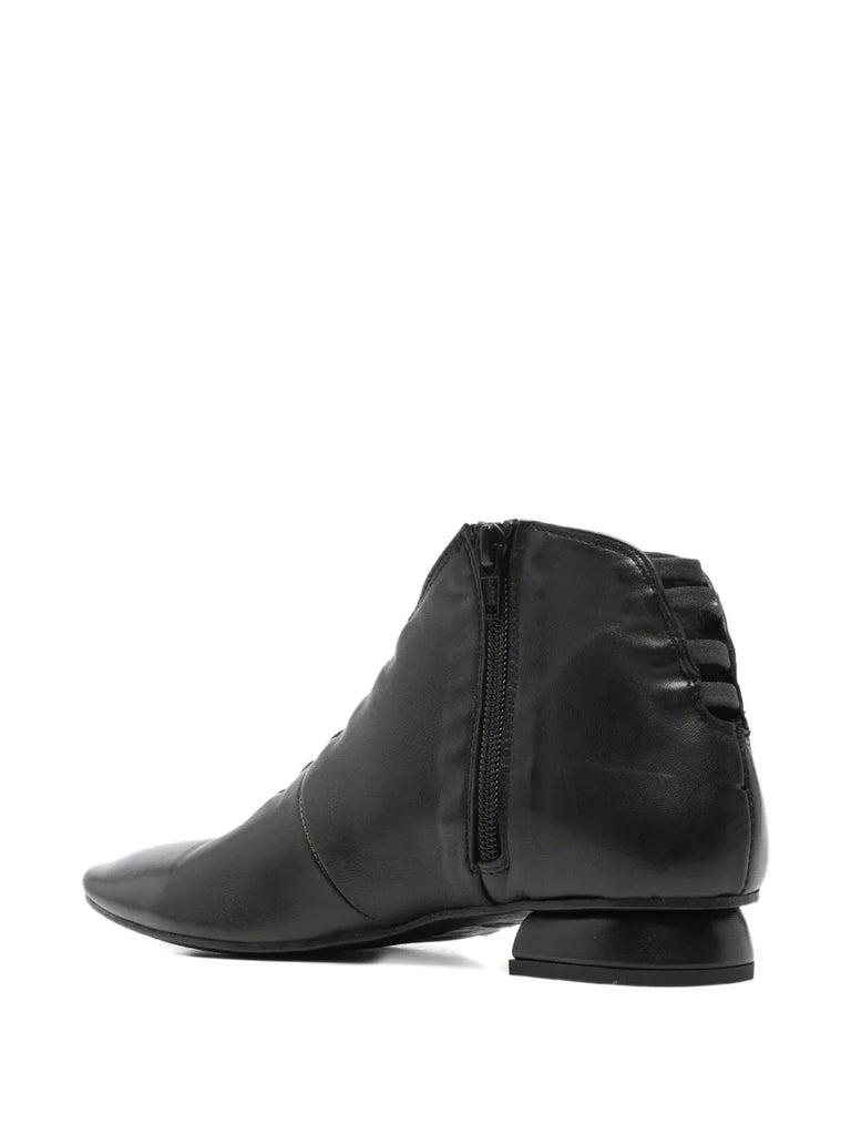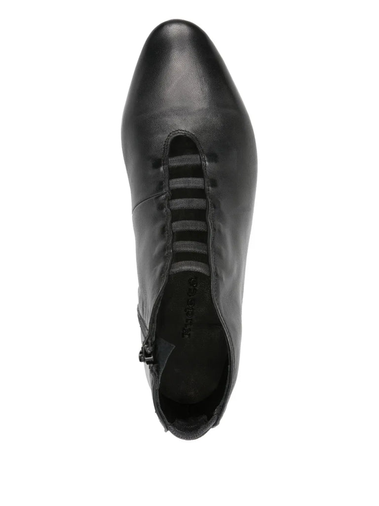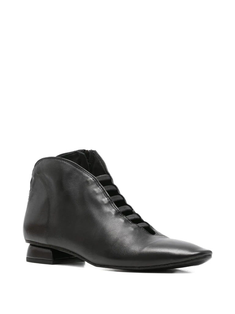 Zapato abotinado de piel de de cabra combinado con tiras, super ligero y elástico en color negro, cremallera lateral y tacón de 3 cm.